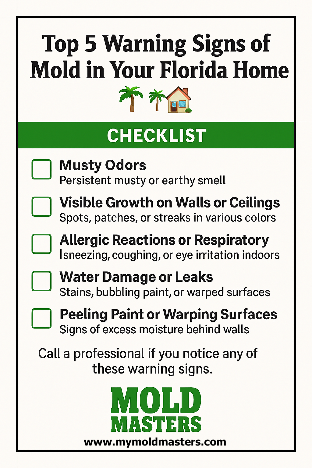 📋 Download our quick-reference checklist: Top 5 Warning Signs of Mold in Your Florida Home. It's perfect for printing or sharing with neighbors!